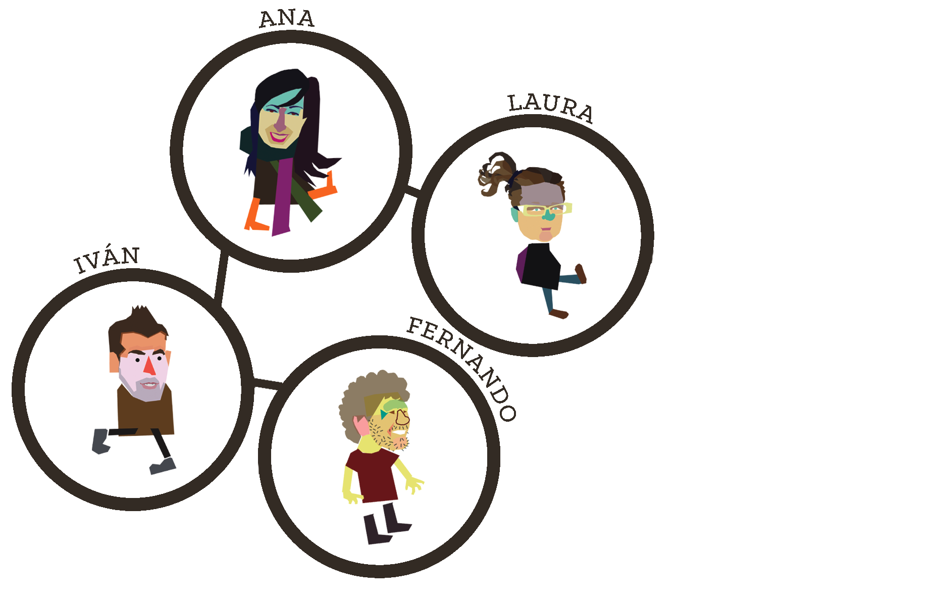 Este es nuestro equipo. Ana es la jefa de la oficina y a su lado está Laura. Iván es el director de proyectos. En la bodega trabaja Fernando, Jorge y Juanlu.