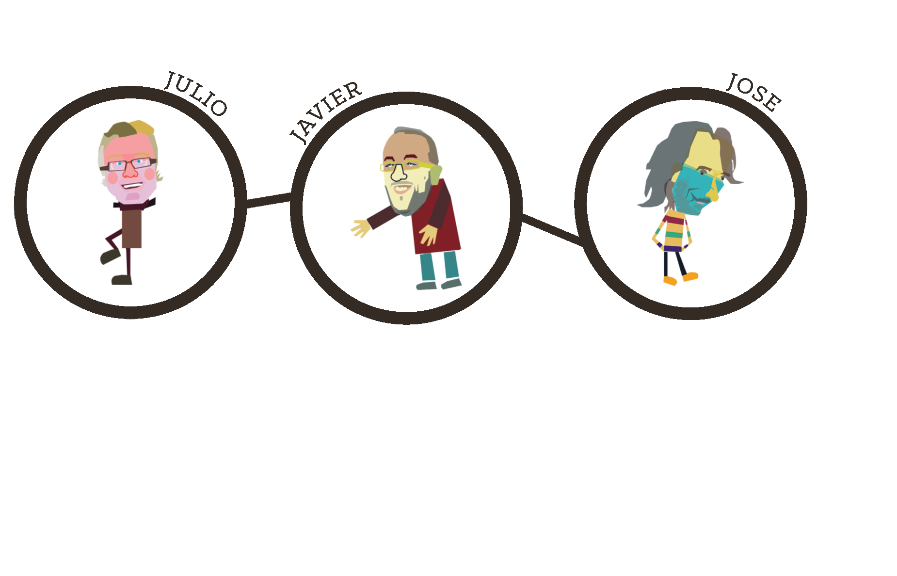 Estos somos nosotros. Julio diseña los vinos, y se ocupa de cuidar de la bodega. Javier vende nuestros vinos que ya están en más de 50 países de todo el mundo. Jose cuida de los "papeles" y de que todo vaya bien fuera de la bodega.